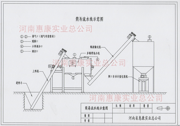 簡(jiǎn)易型流水線主要由螺旋上料機(jī)、多螺帶混合機(jī)、二次提升機(jī)、儲(chǔ)料倉(cāng)、閥口自動(dòng)定量包裝機(jī)等組成。