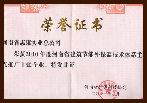 河南省惠康實業(yè)總公司榮獲2010年度河南省建筑節(jié)能外保溫技術(shù)體系重點推廣十強(qiáng)企業(yè)。